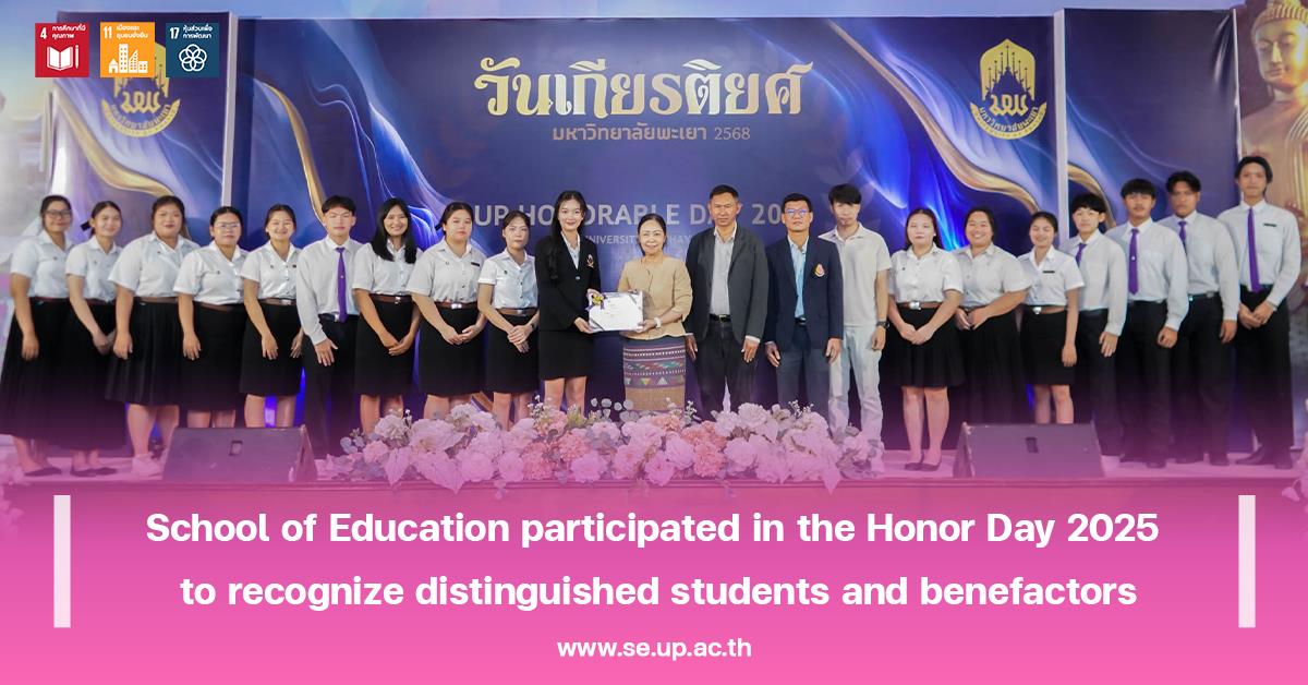 On August 28, 2025, Associate Professor Dr. Ruksit Suttipong, the Dean of the School of Education, assigned Assistant Professor Dr. Sunthon Khlai-Um, the Associate Dean for Administration and Student Quality Development, along with Associate Professor Dr. Natthawut Subphaso, the Assistant Dean, and the School of Education Student Association committee for the academic year 2024, participated in the Honor Day 2025 to recognize distinguished students and benefactors at Mueang Phayao, the University of Phayao. It was honored by Associate Professor Dr. Supakorn Pongbangpho, the President of the University of Phayao, was the president to opened ceremony and gave the honorary award to distinguished persons who support the university’s activity, as well as awarded certificates of honor to 1,260 distinguished students for the academic year 2024, as a token of appreciation and to encourage everyone.