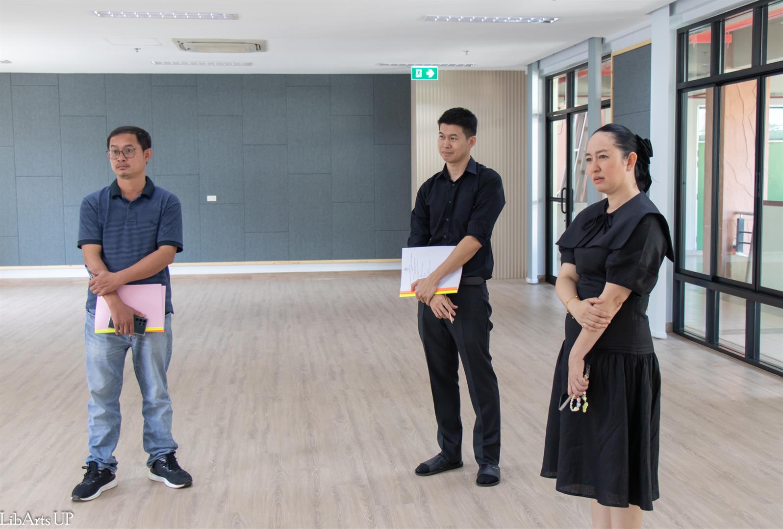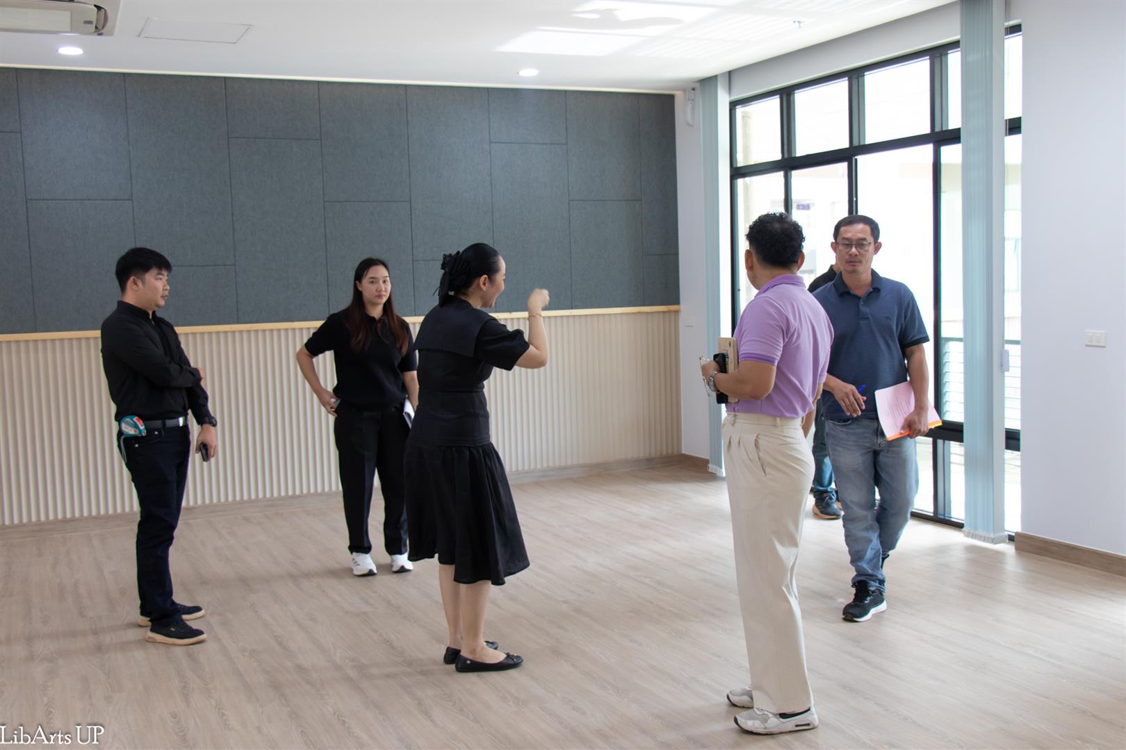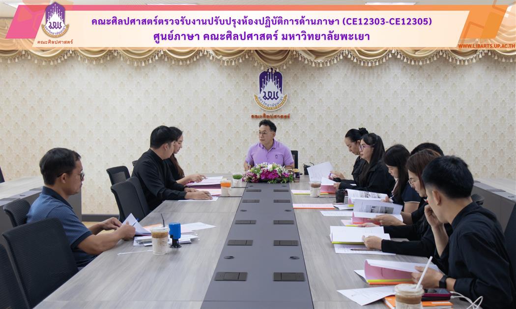 The Inspection Committee of the School of Liberal Arts, led by Dr. Ittiphol Buayoi (Assistant Dean and Committee Chair) and Dr. Chanapa Daungfai (Associate Dean for Special Affairs), together with the committee members, site supervisors, and the contractor, conducted a formal inspection of the renovated 120-Seat Language Testing Center (CE12303-CE12305), School of Liberal Arts, University of Phayao.
