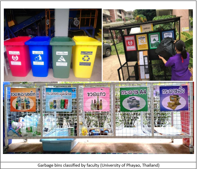 University of Phayao has carried out campaign activities to raise awareness of waste separation from the beginning by creating labels to classify waste according to various trash bins of the university so that staff and students can separate garbage properly. As a result, waste can be utilized in more ways, as shown in Figures 3 and 4.